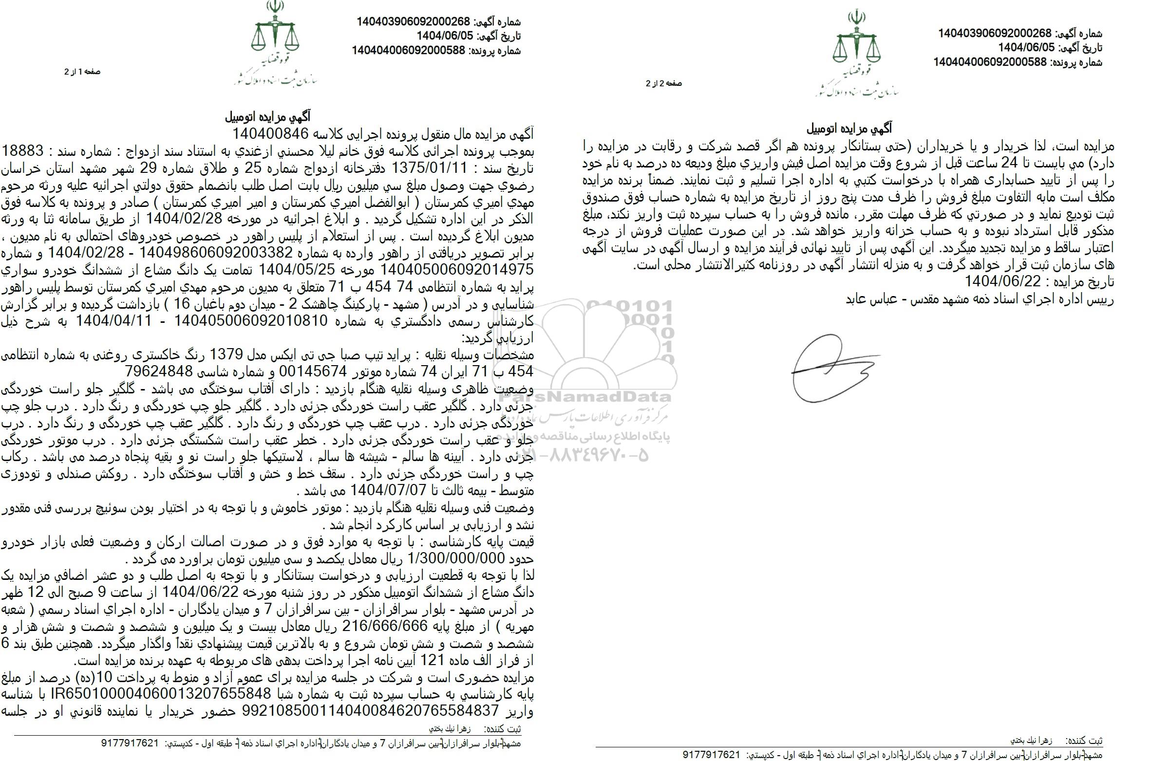 10 مزایده فروش 2 دستگاه خودرو 9699001 1404/07/22 new not special not payed مازندران