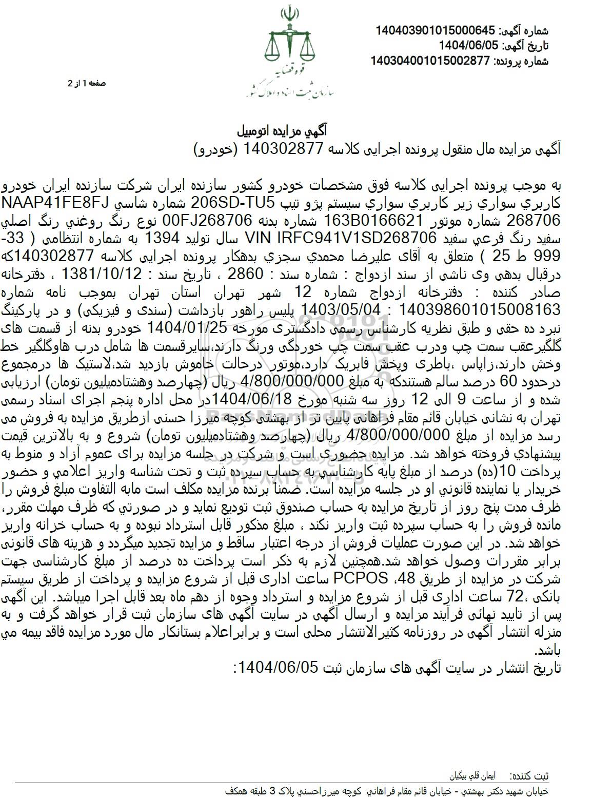 مزایده فروش پژو تیپ 206, مزایده فروش پژو تیپ 206