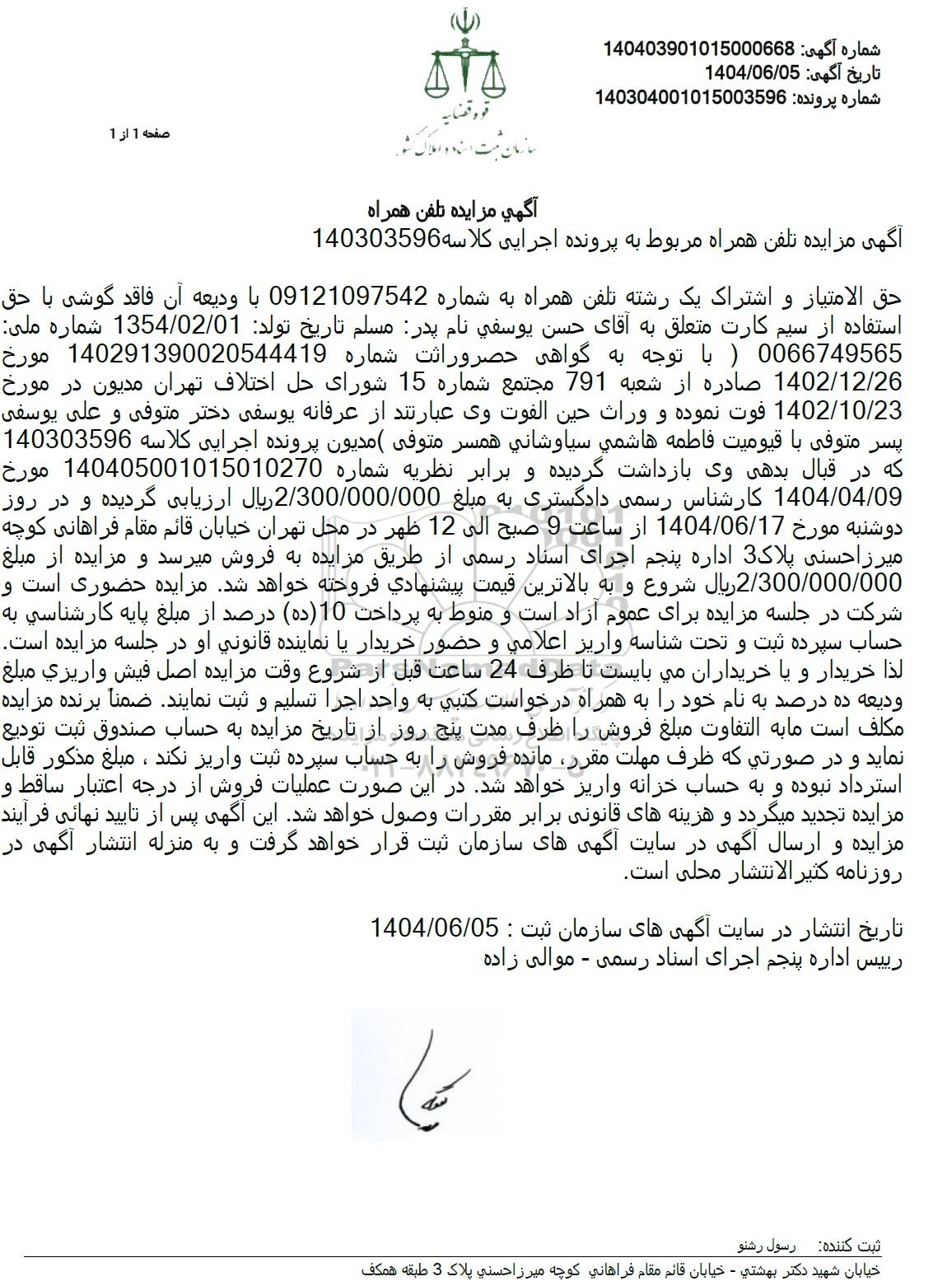 مزایده فروش یک رشته تلفن همراه به شماره 09121097542