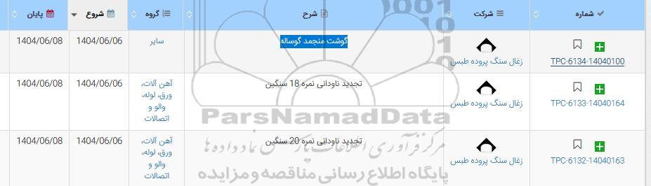 TPC - 6134 - 14040100 | زغال سنگ پروده طبس | گوشت منجمد گوساله | سایر | 1404.06.06 | 1404.06.08 |