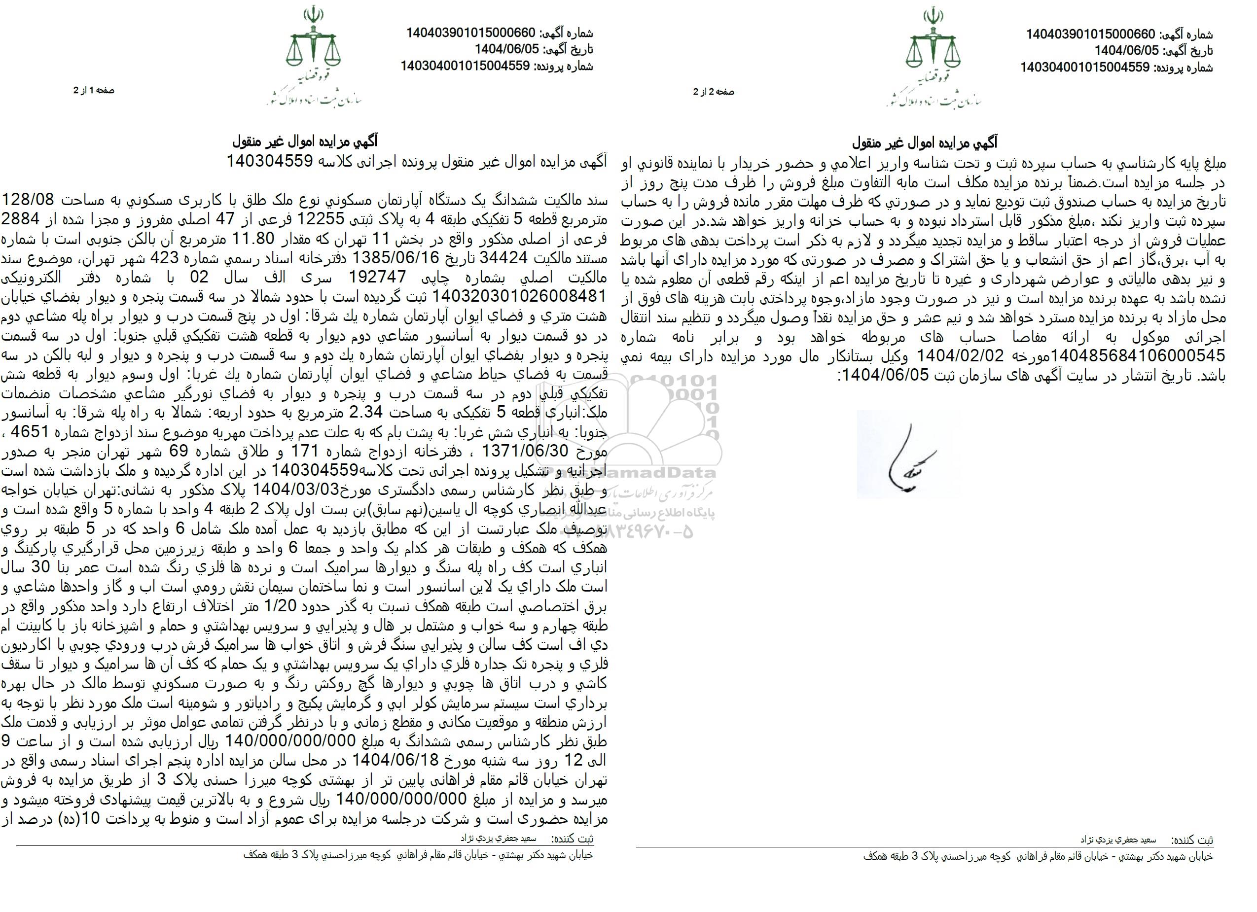 مزایده ششدانگ یک دستگاه آپارتمان مسکونی با کاربری مسکونی 128/08