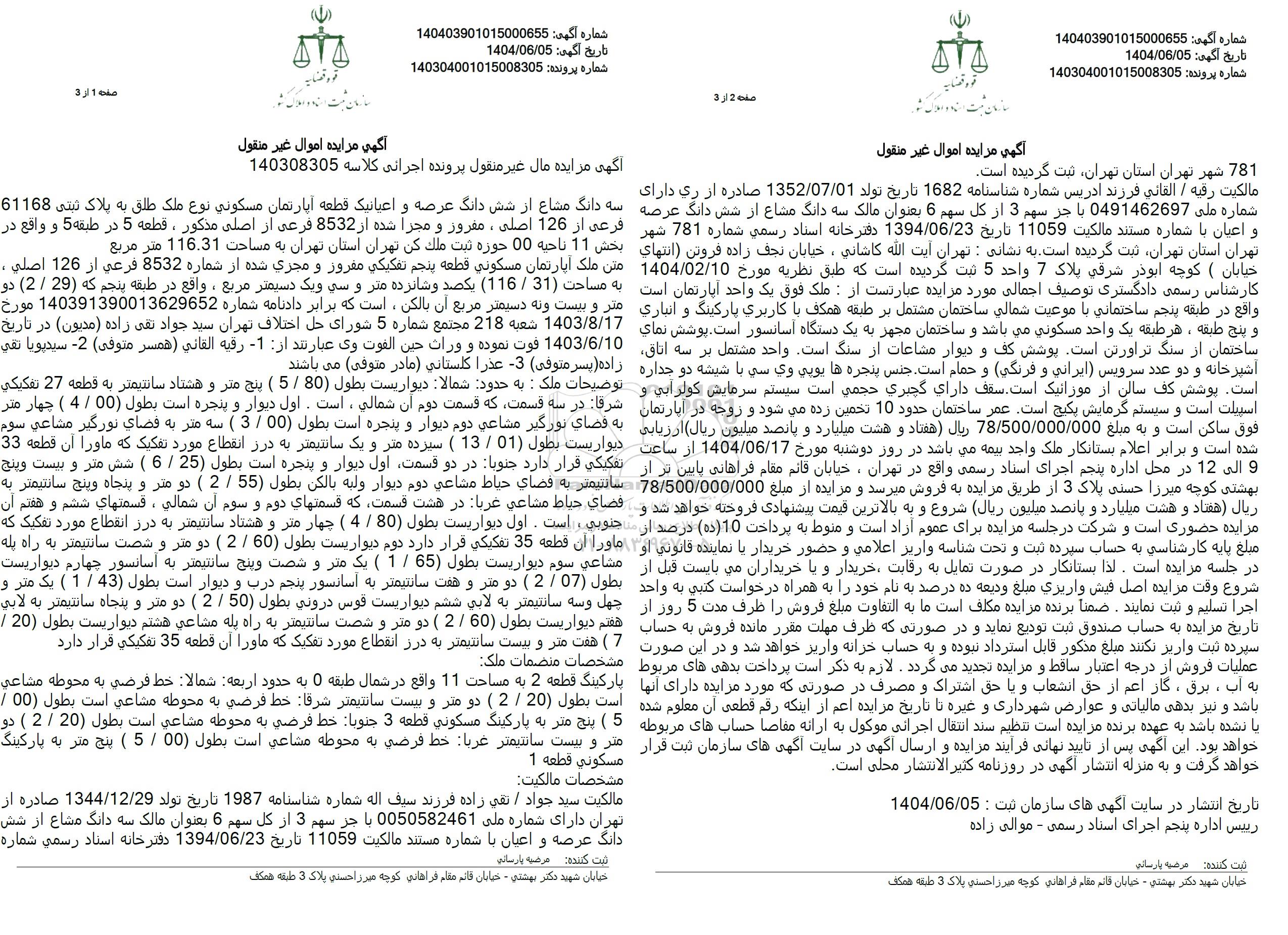 4 مزایده فروش میزان 2 دانگ از شش دانگ یک قطعه آپارتمان مسکونی نوع ملک طلق به پلاک ثبتی 13393 فرعی از 8 اصلی 9699248 1404/07/22 new not special not payed تهران