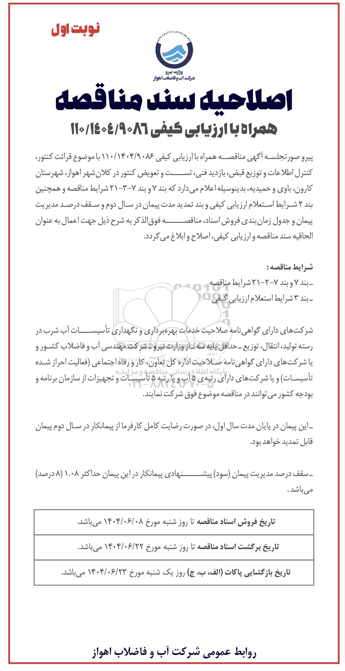 پیرو صورتجلسه آگهی مناقصه همراه با ارزیابی کیفی 110/1404/9086 با موضوع قرائت کنتور کنترل اطلاعات و توزیع قبض بازدید فنی تست و تعویض کنتور در کلان شهر اهواز شهرستان کارون باوی و حمیدیه بدینوسیله اعلام میدارد که بند 7 و بند 7-3-21 شرایط مناقصه و همچنین بند 2 شرایط استعلام ارزیابی کیفی و بند تمدید مدت پیمان در سال دوم و سقف درصد مدیریت پیمان و جدول زمان بندی فروش اسناد مناقصه فوق الذکر به شرح ذیل جهت اعمال به عنوان الحاقيه سند مناقصه و ارزیابی کیفی اصلاح و ابلاغ می گردد.