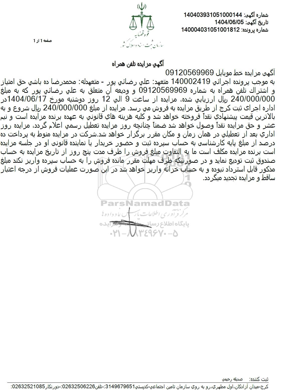 مزایده فروش یک رشته تلفن همراه به شماره 09120569969