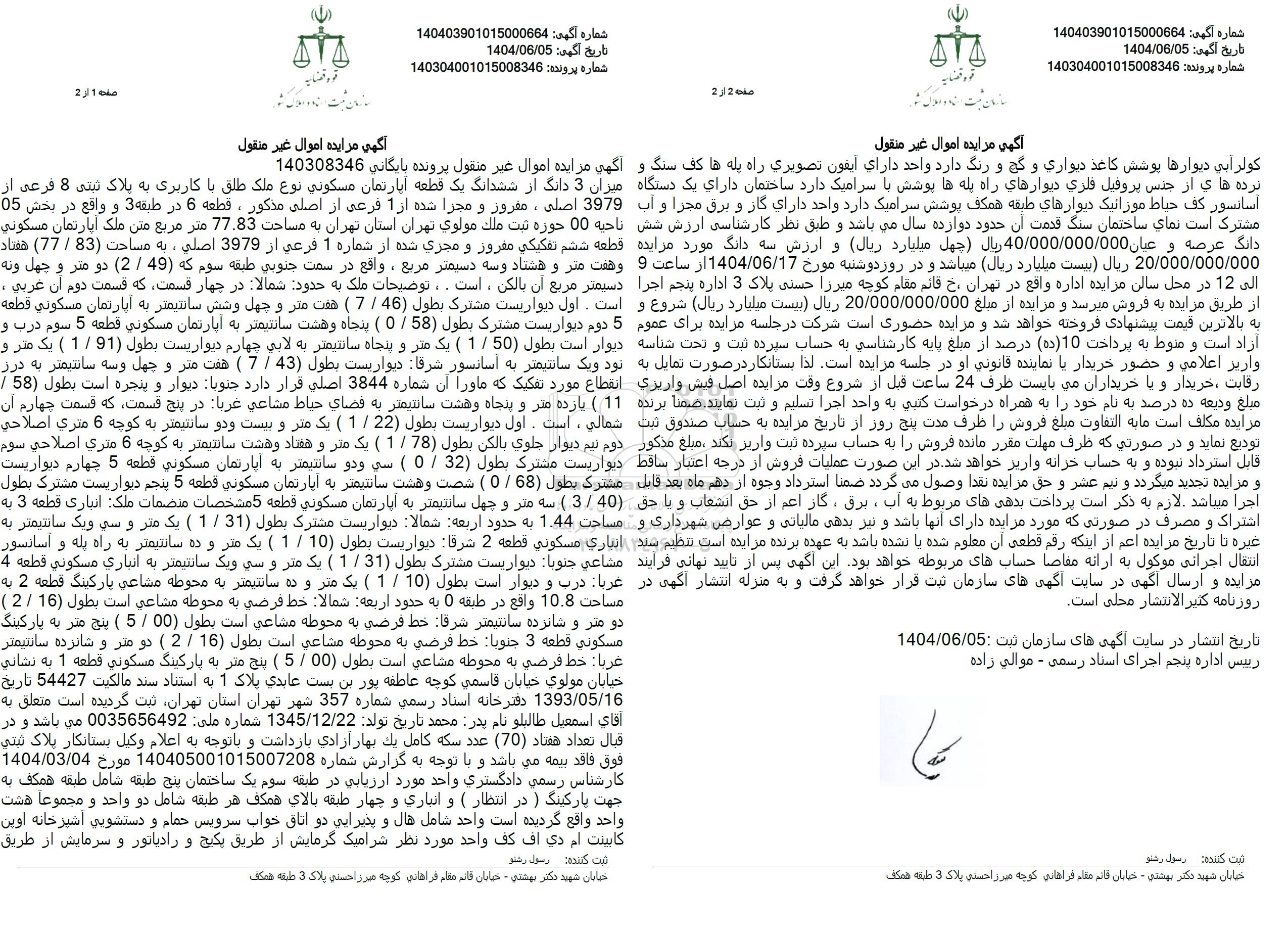 4 مزایده فروش میزان 2 دانگ از شش دانگ یک قطعه آپارتمان مسکونی نوع ملک طلق به پلاک ثبتی 13393 فرعی از 8 اصلی 9699248 1404/07/22 new not special not payed تهران