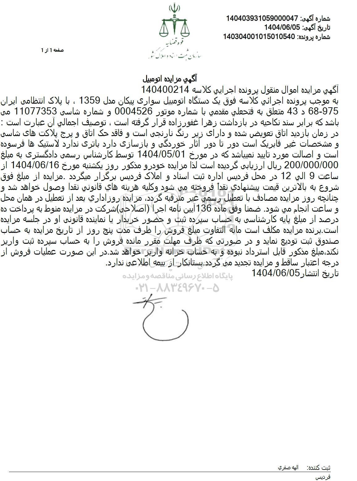مزایده فروش یک دستگاه خوردو پیکان مدل 1359, مزایده فروش یک دستگاه خوردو پیکان مدل 1359