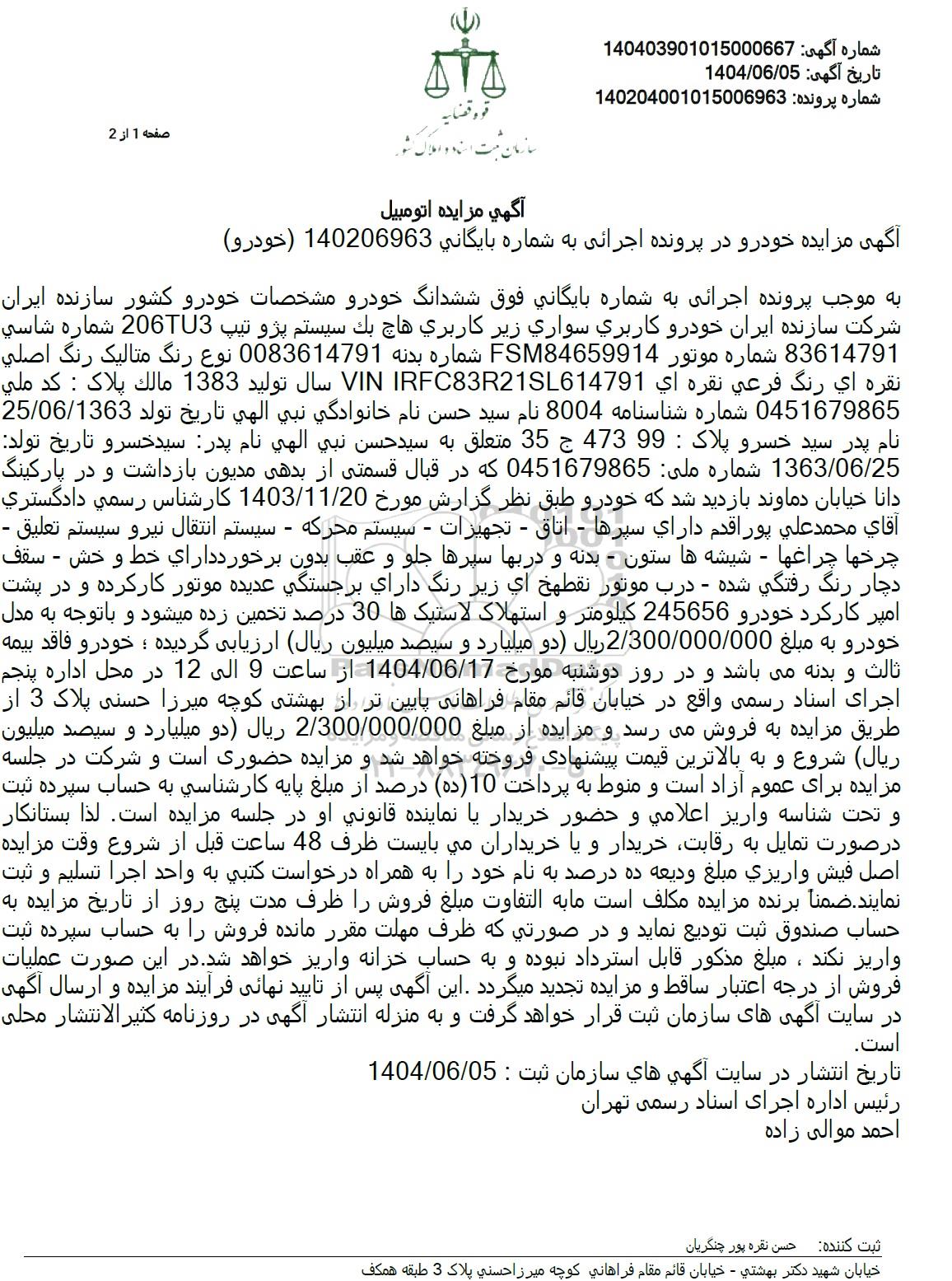 10 مزایده فروش 2 دستگاه خودرو 9699001 1404/07/22 new not special not payed مازندران