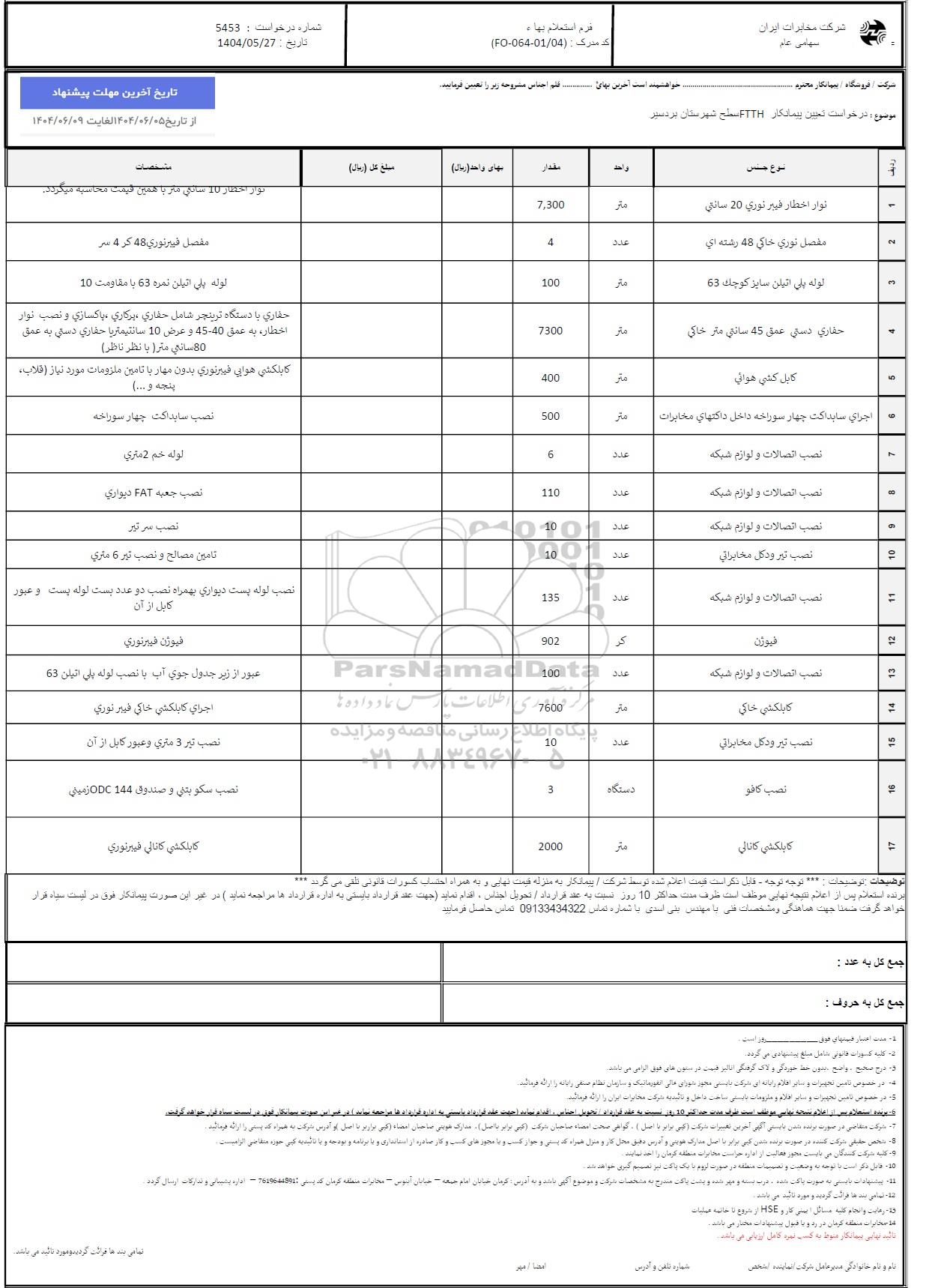 موضوع : درخواست تعیین پیمانکار FTTH سطح شهرستان بردسیر
