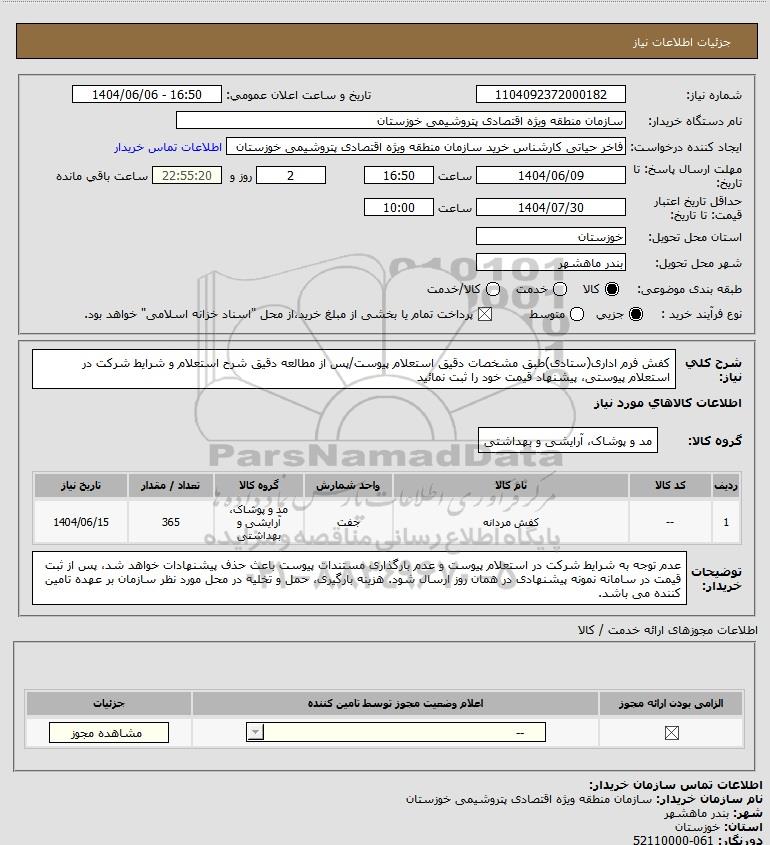 شرح کلی نیاز: کفش فرم اداری(ستادی)طبق مشخصات دقیق استعلام پیوست/پس از مطالعه دقیق شرح استعلام و شرایط شرکت در استعلام پیوستی، پیشنهاد قیمت خود را ثبت نمائید