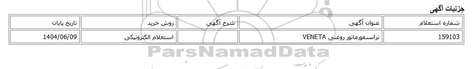 | 159103 | ترانسفورماتور روغنی VENETA | استعلام الکترونیکی | 1404/06/09 |