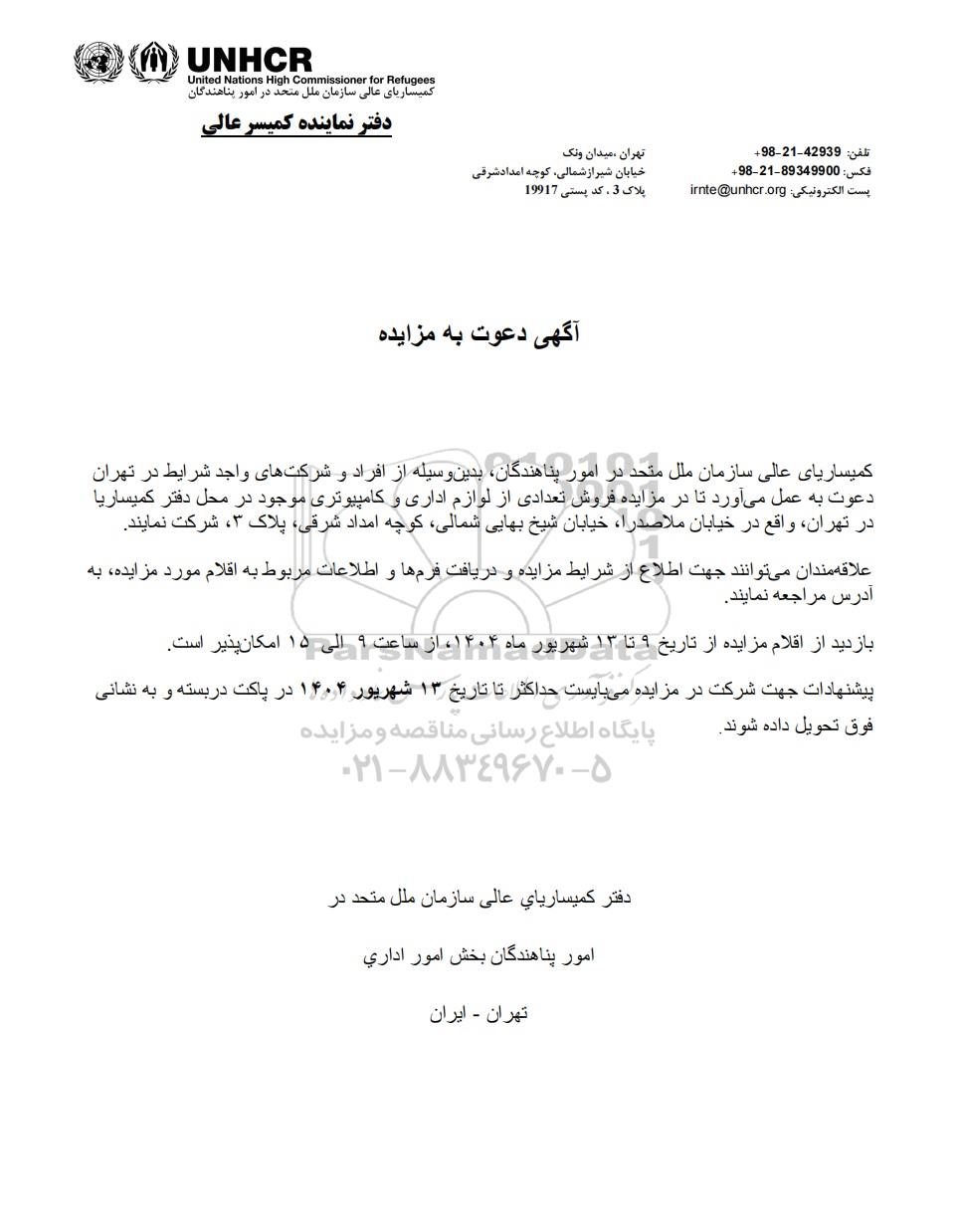 کمیساریای عالی سازمان ملل متحد در امور پناهندگان، بدین وسیله از افراد و شرکت های واجد شرایط در تهران دعوت به عمل می آورد تا در مزایده فروش تعدادی از لوازم اداری و کامپیوتری موجود در محل دفتر کمیساریا در تهران، واقع در خیابان ملاصدرا، خیابان شیخ بهایی شمالی، کوچه امداد شرقی، پلاک 3 ، شرکت نمایند.