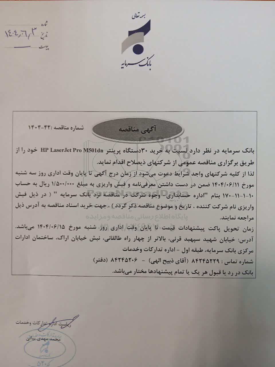 بانک سرمایه در نظر دارد نسبت به خرید 30 دستگاه پرینتر HP LaserJet Pro M501dn خود را از طریق برگزاری مناقصه عمومی از شرکتهای ذیصلاح اقدام نماید.