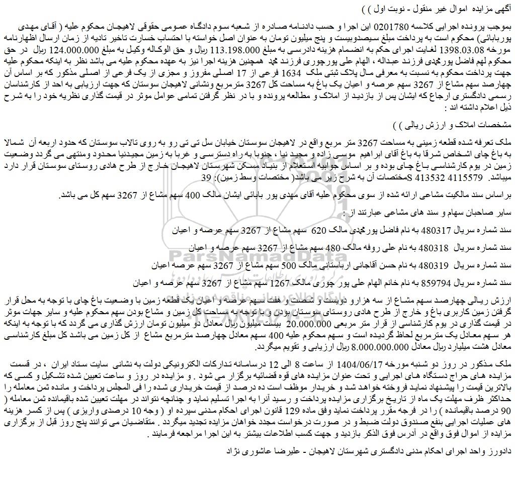 بموجب پرونده اجرایی کلاسه 0201780 این اجرا و حسب دادنامه صادره از شعبه سوم دادگاه عمومی حقوقی لاهیجان محکوم علیه ( آقای مهدی پوربابائی) محکوم است به پرداخت مبلغ سیصدوبیست و پنج میلیون تومان به عنوان اصل خواسته با احتساب خسارت تاخیر تادیه از زمان ارسال اظهارنامه مورخه 1398.03.08 لغایت اجرای حکم به انضمام هزینه دادرسی به مبلغ 113.198.000 ریال و حق الوکاله وکیل به مبلغ 124.000.000 ریال در حق محکوم لهم فاضل پورمحمدی فرزند عبداله ، الهام علی پورچوری فرزند محمد همچنین هزینه اجرا نیز به عهده محکوم علیه می باشد نظر به اینکه محکوم علیه جهت پرداخت محکوم به نسبت به معرفی مال پلاک ثبتی ملک 1634 فرعی از 17 اصلی مفروز و مجزی از یک فرعی از اصلی مذکور که بر اساس آن چهارصد سهم مشاع از 3267 سهم عرصه و اعیان یک باغ به مساحت کل 3267 مترمربع ونشانی لاهیجان سوستان که جهت ارزیابی به احد از کارشناسان رسمی دادگستری ارجاع که ایشان پس از بازدید از املاک و مطالعه پرونده و با در نظر گرفتن تمامی عوامل موثر در قیمت گذاری نظریه خود را به شرح ذیل اعلام داشته اند :