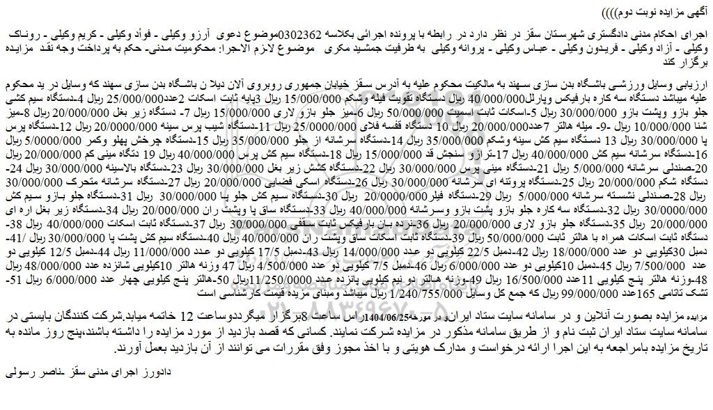 ارزیابی وسایل ورزشی باشگاه بدن سازی سهند به مالکیت محکوم علیه به آدرس سقز خیابان جمهوری روبروی آلان دیلا ن باشگاه بدن سازی سهند که وسایل در ید محکوم علیه میباشد دستگاه سه کاره بارفیکس وپارلل40/000/000 ریال دستگاه تقویت فیله وشکم 15/000/000 ریال 3پایه ثابت اسکات 2عدد25/000/000 ریال 4-دستگاه سیم کشی جلو بازو وپشت بازو 30/000/000 ریال 5-اسکات ثابت اسمیت 50/000/000 ریال 6-میز جلو بازو لاری 15/000/000 ریال 7- دستگاه زیر بغل 20/000/000 ریال 8-میز شنا 10/000/000 ریال -9- میله هالتر 7عدد20/000/000 ریال 10 دستگاه قفسه فلای 25/0000/000 ریال 11-دستگاه شیب پرس سینه 20/0000/000 ریال 12-دستگاه پرس پا 30/000/000 ریال 13 دستگاه سیم کش سینه وشکم 35/000/000 ریال 14-دستگاه سرشانه از جلو 35/000/000 ریال 15-دستگاه چرخش پهلو وکمر 5/0000/000 ریال 16-دستگاه سرشانه سیم کش 40/000/000 ریال 17-ترازو سنجش قد 15/000/000 ریال 18-دستگاه سیم کش پرس 40/000/000 ریال 19 دتگاه مینی کم 20/000/000 ریال 20-صندلی سرشانه 5/000/000 ریال 21-دستگاه مینی پرس 30/000/000 ریال 22-دستگاه کشش زیر بغل 30/000/000 ریال 23-دستگاه بالاسینه 30/000/000 ریال 24-دستگاه شکم 20/000/000 ریال 25-دستگاه پروتنه ای سرشانه 30/000/000 ریال 26-دستگاه اسکی فضایی 20/000/000 ریال 27-دستگاه سرشانه متحرک 30/000/000 ریال 28-صندلی نشسته سرشانه 5/000/000 ریال 29-دستگاه فیلر20/0000/000 ریال 30-دستگاه سیم کش جلو پا 30/000/000 ریال 31-دستگاه جلو بازو سیم کش 30/0000/000 ریال 32-دستگاه سه کاره جلو بازو پشت بازو وسرشانه 40/000/000 ریال 33-دستگاه ساق پا وپشت ران 20/000/000 ریال 34-دستگاه زیر بغل اره ای 20/000/000 ریال 35-دستگاه جلو بازو لاری 20/000/000 ریال 36-نرده بان بارفیکس ثابت سقفی 30/000/000 ریال 37-دستگاه ثابت اسکات 40/000/000 ریال 38-دستگاه ثابت اسکات همراه با هالتر ثابت 50/000/000 ریال 39-دستگاه ثابت اسکات ساق وپشت ران 40/000/000 ریال 40-دستگاه سیم کش پشت پا 30/000/000 ریال /41-دمبل 30کیلویی دو عدد 18/000/000 ریال 42-دمبل 22/5 کیلویی دو عدد 14/000/000 ریال 43-دمبل 17/5 کیلویی دو عدد 11/000/000 ریال 44-دمبل 12/5 کیلویی دو عدد 7/500/000 ریال 45-دمبل 10کیلویی دو عدد 6/000/000 ریال 46-دمبل 7/5 کیلویی دو عدد 4/500/000 ریال 47 وزنه هالتر 10کیلویی شانزده عدد 48/000/000 ریال 48-وزنه هالتر پنج کیلویی 11عدد 16/500/000 ریال 49-وزنه هالتر دو نیم کیلویی پانزده عدد 11/250/0000ریال 50-هالتر پنج کیلویی چهار عدد 6/000/000 ریال 51-تشک تاتامی 165عدد 99/000/000 ریال که جمع کل وسایل 1/240/755/000 ریال میباشد ومبنای مزیده قیمت کارشناسی است