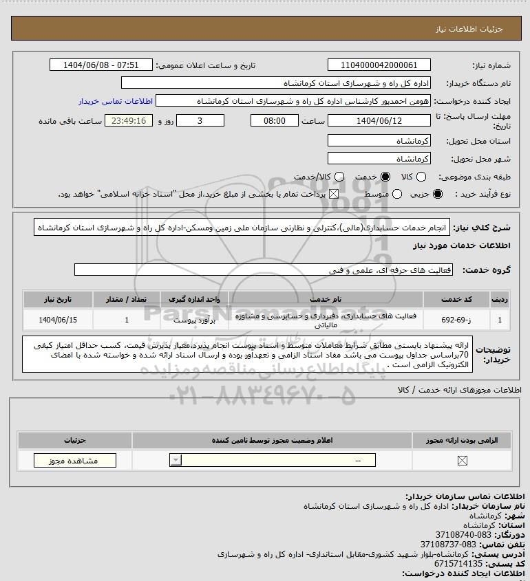 شرح کلی نیاز: انجام خدمات حسابداری(مالی)،کنترلی و نظارتی سازمان ملی زمین ومسکن-اداره کل راه و شهرسازی استان کرمانشاه