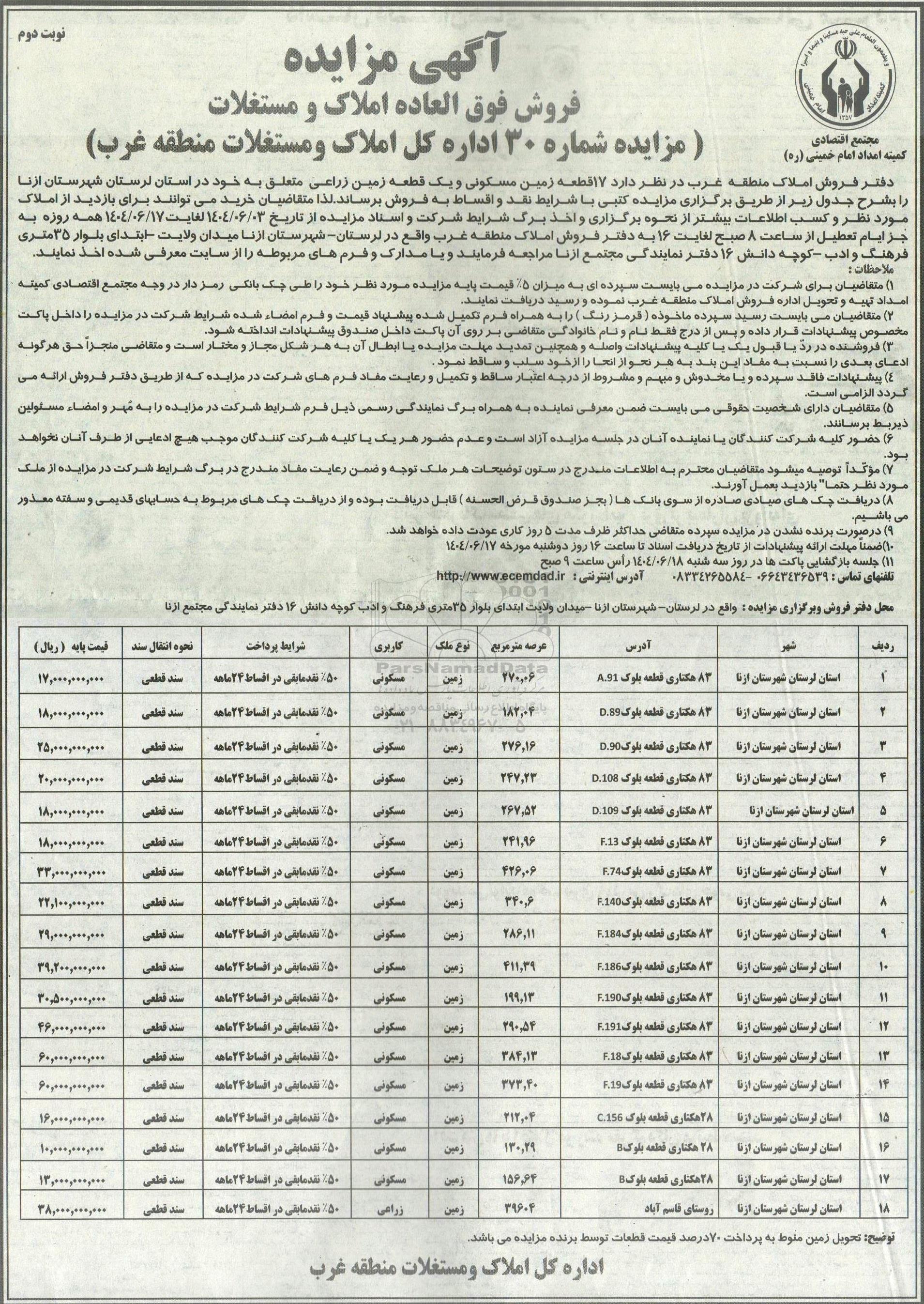 فروش فوق العاده املاک و مستغلات (مزایده شماره 30 اداره کل املاک و مستغلات منطقه غرب )