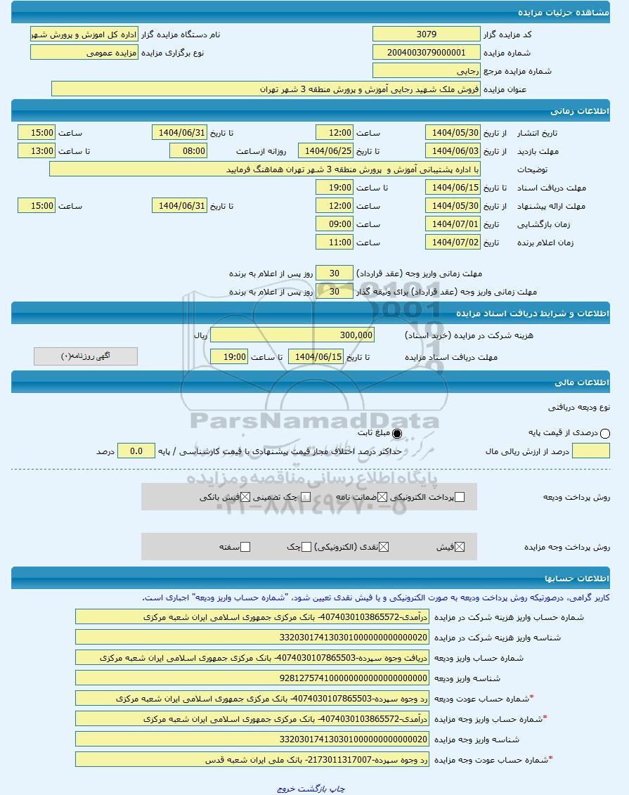 عنوان مزایدهفروش ملک شهید رجایی آموزش و پرورش منطقه 3 شهر تهران -مزایده زمین و مستحدثات - استان تهران
