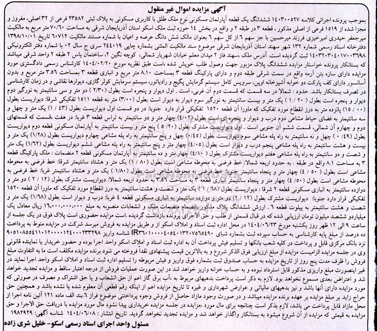 مزایده فروش ششدانگ یک قطعه آپارتمان مسکونی با پلاک ثبتی 23582 فرعی از 32 اصلی