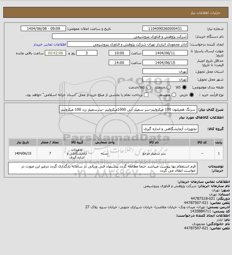 نام دستگاه خریدار:شرکت پژوهش و فناوری پتروشیمی