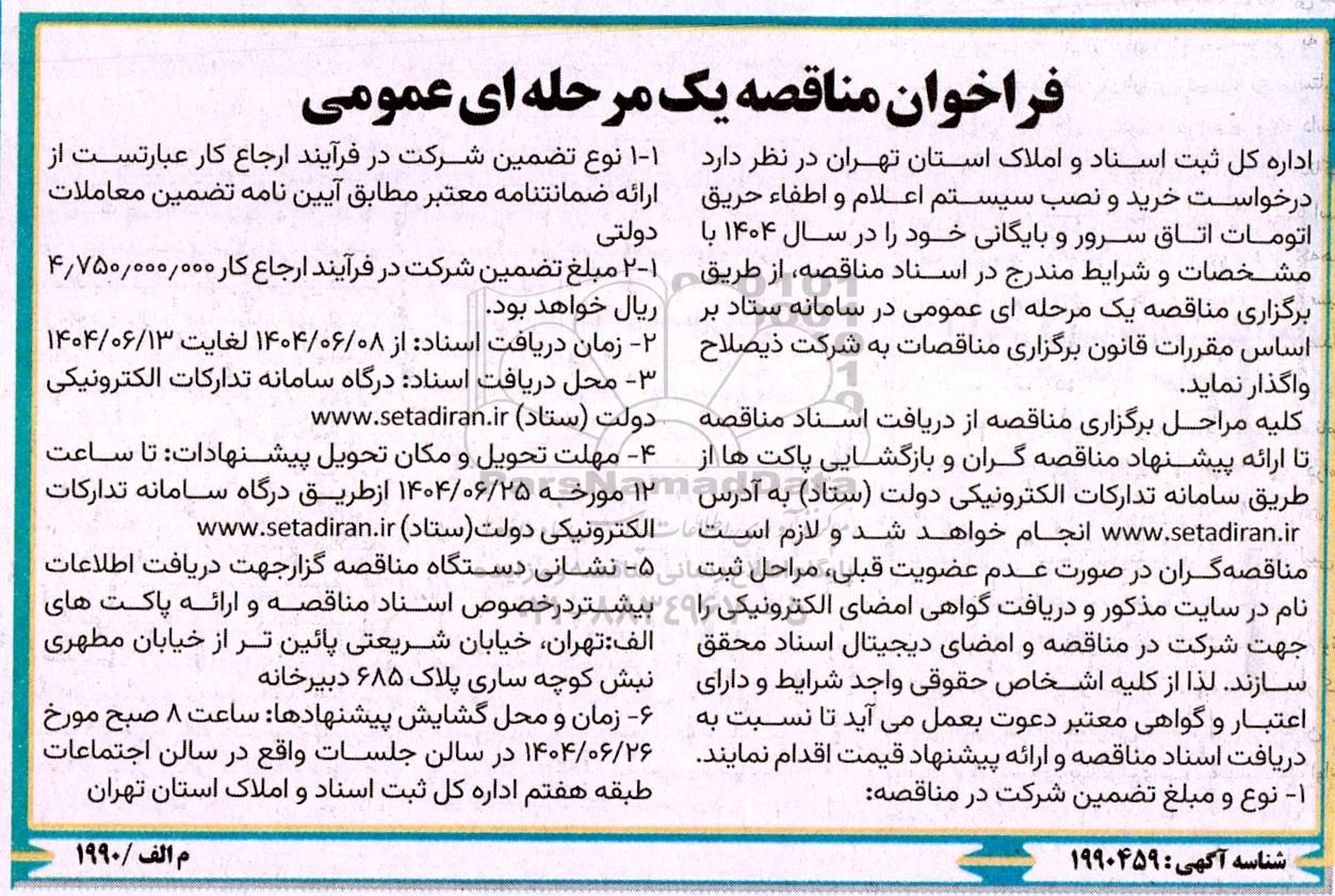 اداره کل ثبت اسناد و املاک استان تهران در نظر دارد درخواست خرید و نصب سیستم اعلام و اطفاء حریق اتومات اتاق سرور و بایگانی خود را در سال 1404 با مشخصات و شرایط مندرج در اسناد مناقصه، از طریق برگزاری مناقصه یک مرحله ای عمومی در سامانه ستاد بر اساس مقررات قانون برگزاری مناقصات به شرکت ذیصلاح واگذار نماید