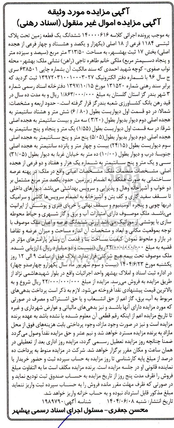 مزایده فروش یک قطعه زمین به پلاک ثبتی 1184 فرعی از 18 اصلی, مزایده فروش یک قطعه زمین به پلاک ثبتی 1184 فرعی از 18 اصلی