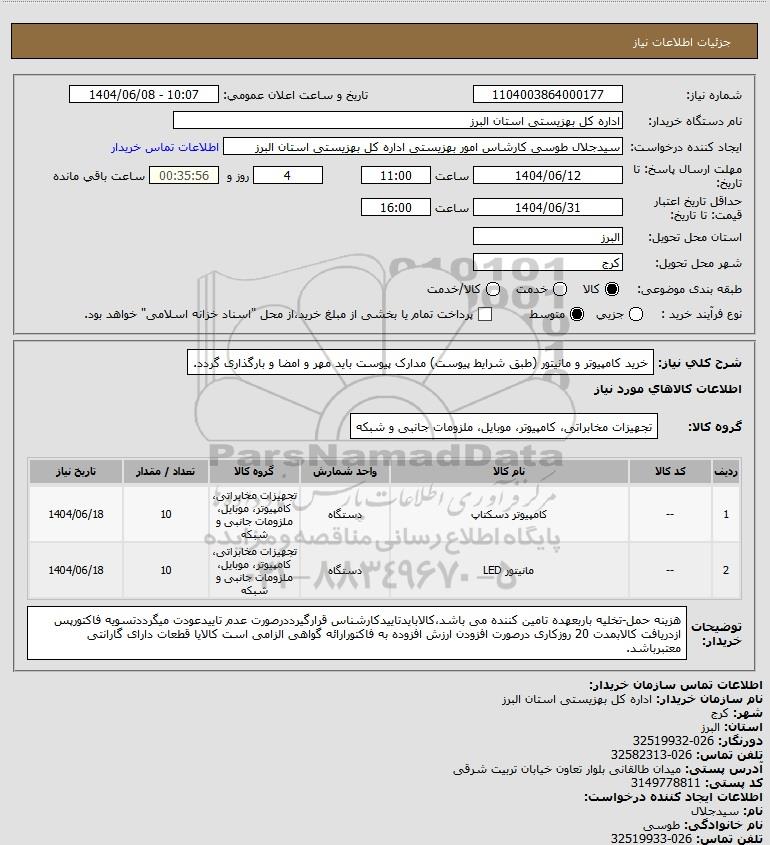 شرح کلی نیاز: خرید کامپیوتر و مانیتور (طبق شرایط پیوست) مدارک پیوست باید مهر و امضا و بارگذاری گردد.