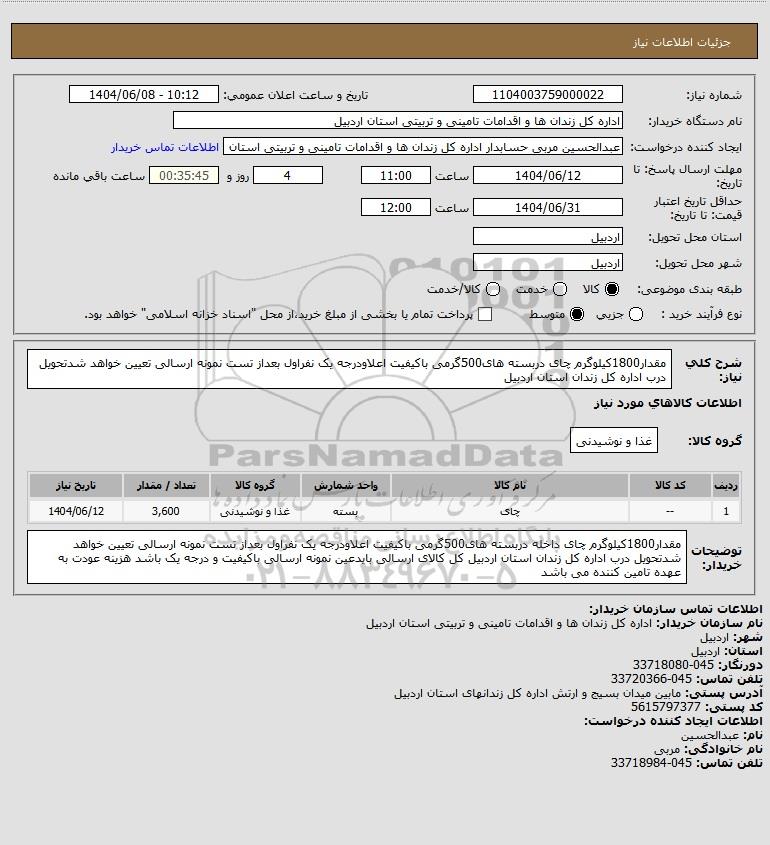 استعلام مقدار1800کیلوگرم چای دربسته های500گرمی باکیفیت اعلاودرجه یک نفراول بعداز تست نمونه ارسالی تعیین خواهد شدتحویل درب اداره کل زندان استان اردبیل, استعلام مقدار1800کیلوگرم چای دربسته های500گرمی باکیفیت اعلاودرجه یک نفراول بعداز تست نمونه ارسالی تعیین خواهد شدتحویل درب اداره کل زندان استان اردبیل