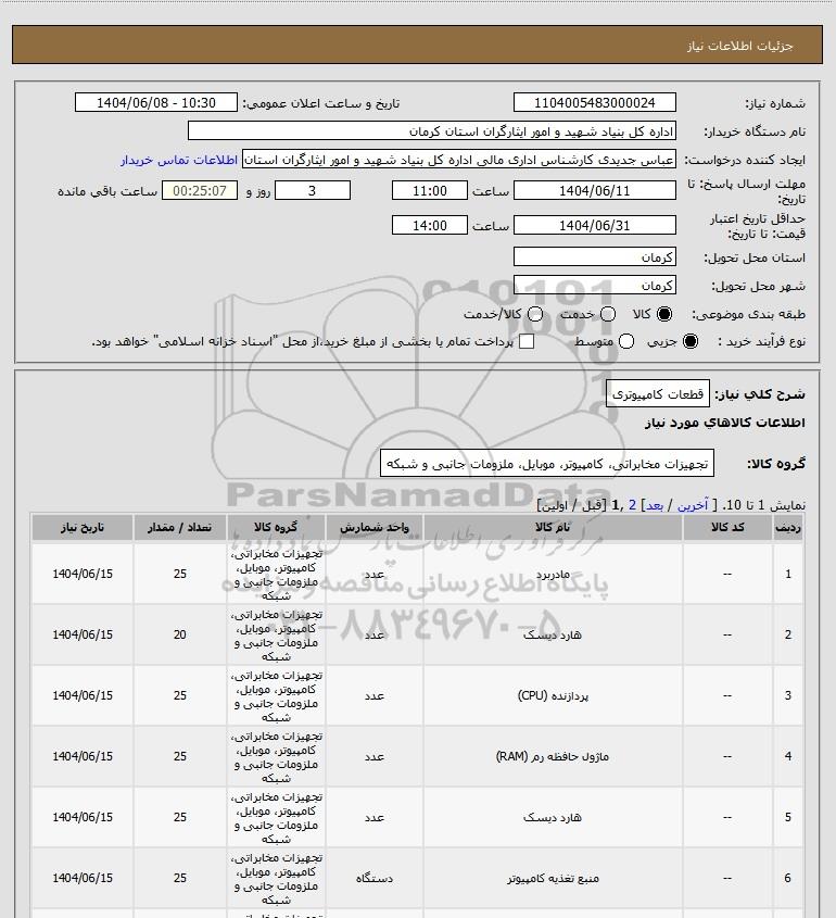 | 3 | -- | پردازنده (CPU) | عدد | تجهیزات مخابراتی، کامپیوتر، موبایل، ملزومات جانبی و شبکه | 25 | 1404/06/15 |