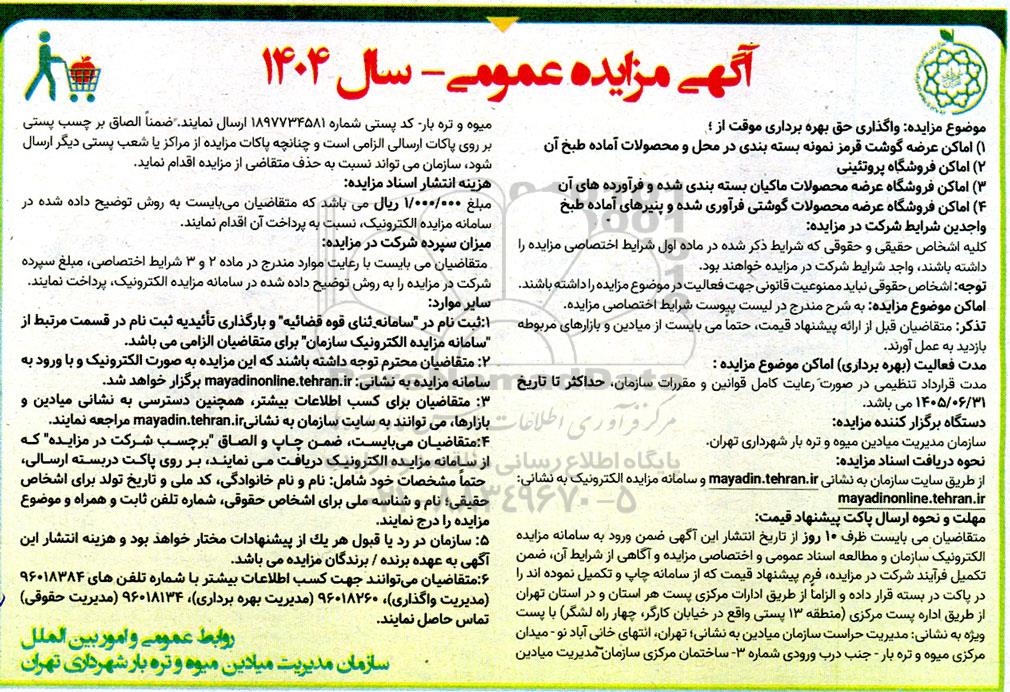 دستگاه برگزار کننده مزایده: سازمان مدیریت میادین میوه و تره بار شهرداری تهران