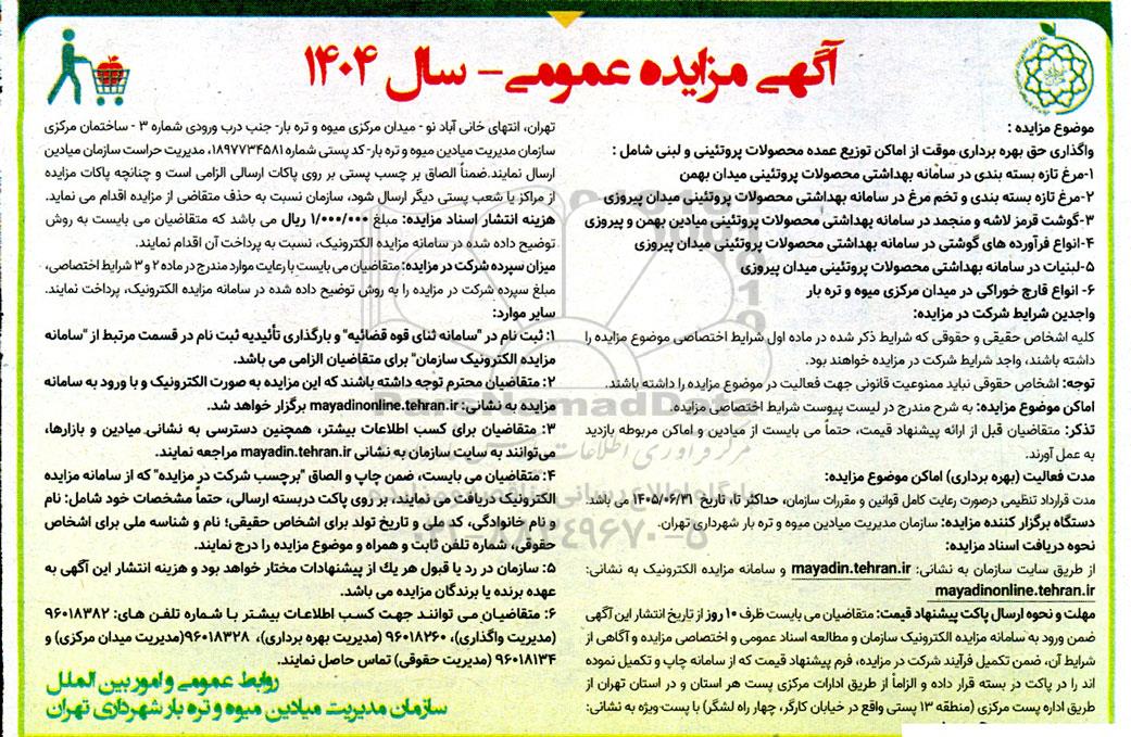موضوع مزایده : واگذاری حق بهره برداری موقت از اماکن توزیع عمده محصولات پروتئینی و لبنی شامل :