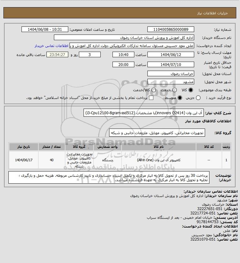 | 1 | -- | کامپیوتر آل این وان (All in One) | دستگاه | تجهیزات مخابراتی، کامپیوتر، موبایل، ملزومات جانبی و شبکه | 40 | 1404/06/17 |