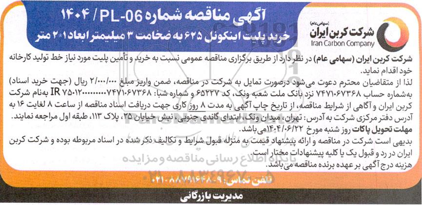 شرکت کربن ایران (سهامی عام) در نظر دارد از طریق برگزاری مناقصه عمومی نسبت به خرید و تأمین پلیت مورد نیاز خط تولید کارخانه خود اقدام نماید.