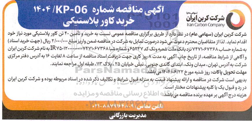 شرکت کربن ایران (سهامی عام) در نظر دارد از طریق برگزاری مناقصه عمومی نسبت به خرید و تامین 40 تن کاور پلاستیکی مورد نیاز خود اقدام نماید.