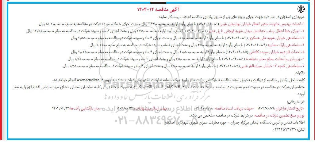 شهرداری اصفهان در نظر دارد جهت اجرای پروژه های زیر از طریق برگزاری مناقصه انتخاب پیمانکار نماید
