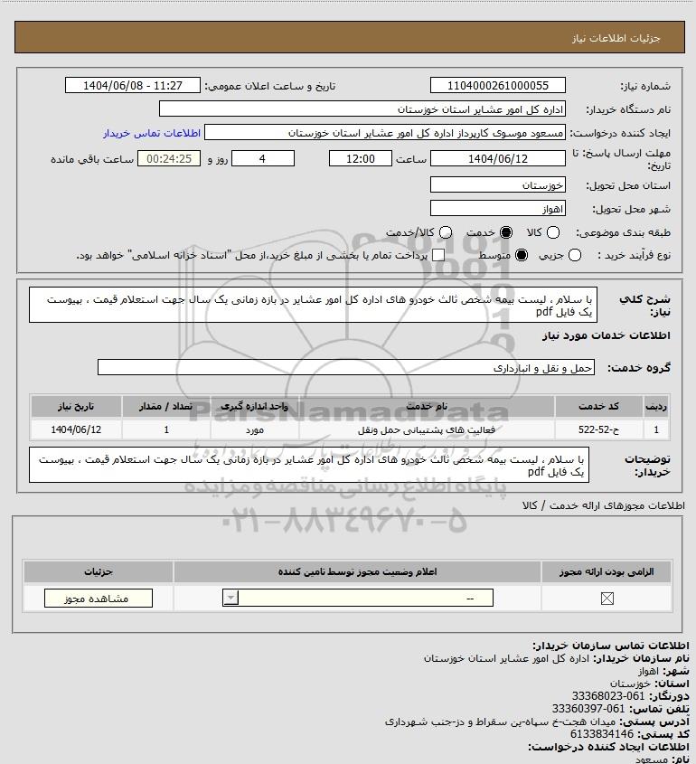استعلام با سلام لیست بیمه شخص ثالث خودرو های اداره کل امور عشایر در بازه زمانی یک سال جهت استعلام قیمت بپیوست یک فایل pdf, استعلام با سلام ، لیست بیمه شخص ثالث خودرو های اداره کل امور عشایر در بازه زمانی یک سال جهت استعلام قیمت ، بپیوست یک فایل pdf