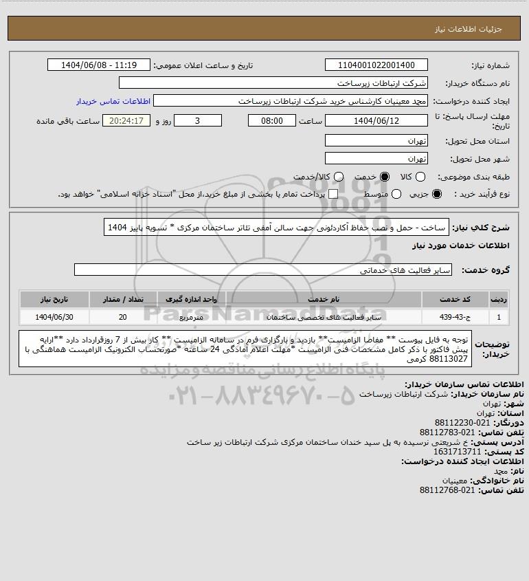 شرح کلی نیاز: ساخت - حمل و نصب حفاظ آکاردئونی جهت سالن آمفی تئاتر ساختمان مرکزی * تسویه پاییز 1404