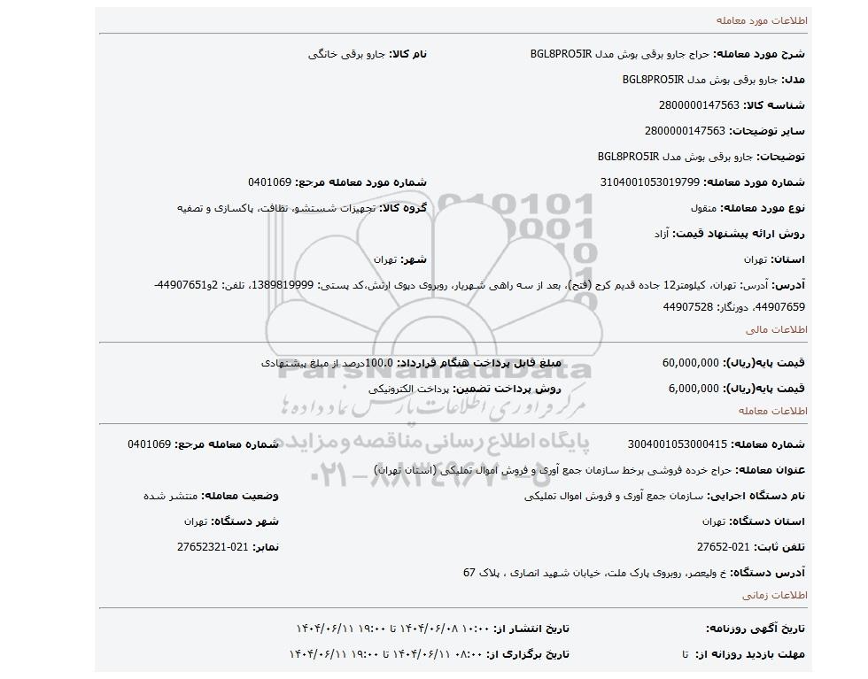 نام دستگاه اجرایی: سازمان جمع آوری و فروش اموال تملیکیوضعیت معامله: منتشر شده