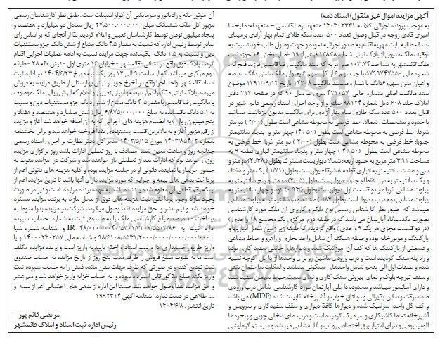 9 مزایده دستور فروش ملک مشاعی 9810687 1404/08/15 new not special not payed آذربایجان شرقی