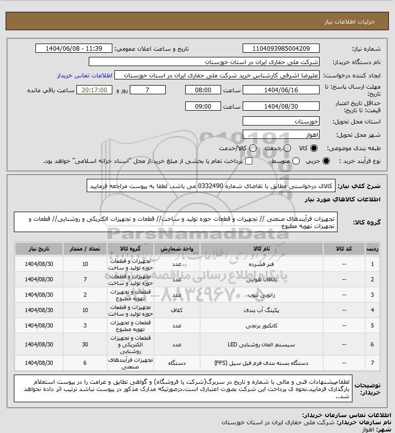 شرح کلی نیاز: کالای درخواستی مطابق با تقاضای شماره 0332490 می باشد. لطفا به پیوست مراجعه فرمایید