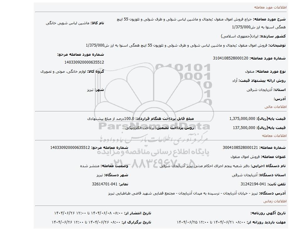 | نام دستگاه اجرایی: دفتر شعبه پنجم اجرای احکام مدنی تبریز آذربایجان شرقی | وضعیت معامله: منتشر شده | |