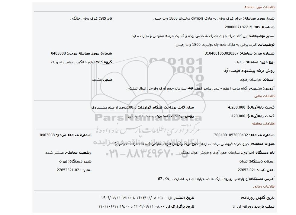 | عنوان معامله: حراج خرده فروشی برخط سازمان جمع آوری وفروش اموال تملیکی (استان خراسان رضوی) | ||