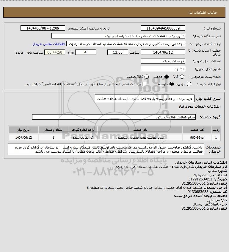 شرح کلی نیاز: خرید پرده ، پرچم و ریسه پارچه فضا سازی تابستان منطقه هشت