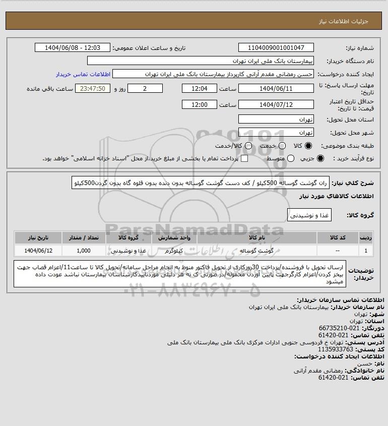 شرح کلی نیاز: ران گوشت گوساله 500کیلو / کف دست گوشت گوساله بدون دنده بدون قلوه گاه بدون گردن500کیلو