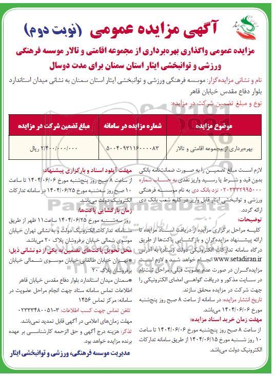 مزایده عمومی واگذاری بهره برداری از مجموعه اقامتی و تالار موسسه فرهنگی ، ورزشی و توانبخشی ایثار استان سمنان برای مدت دو سال