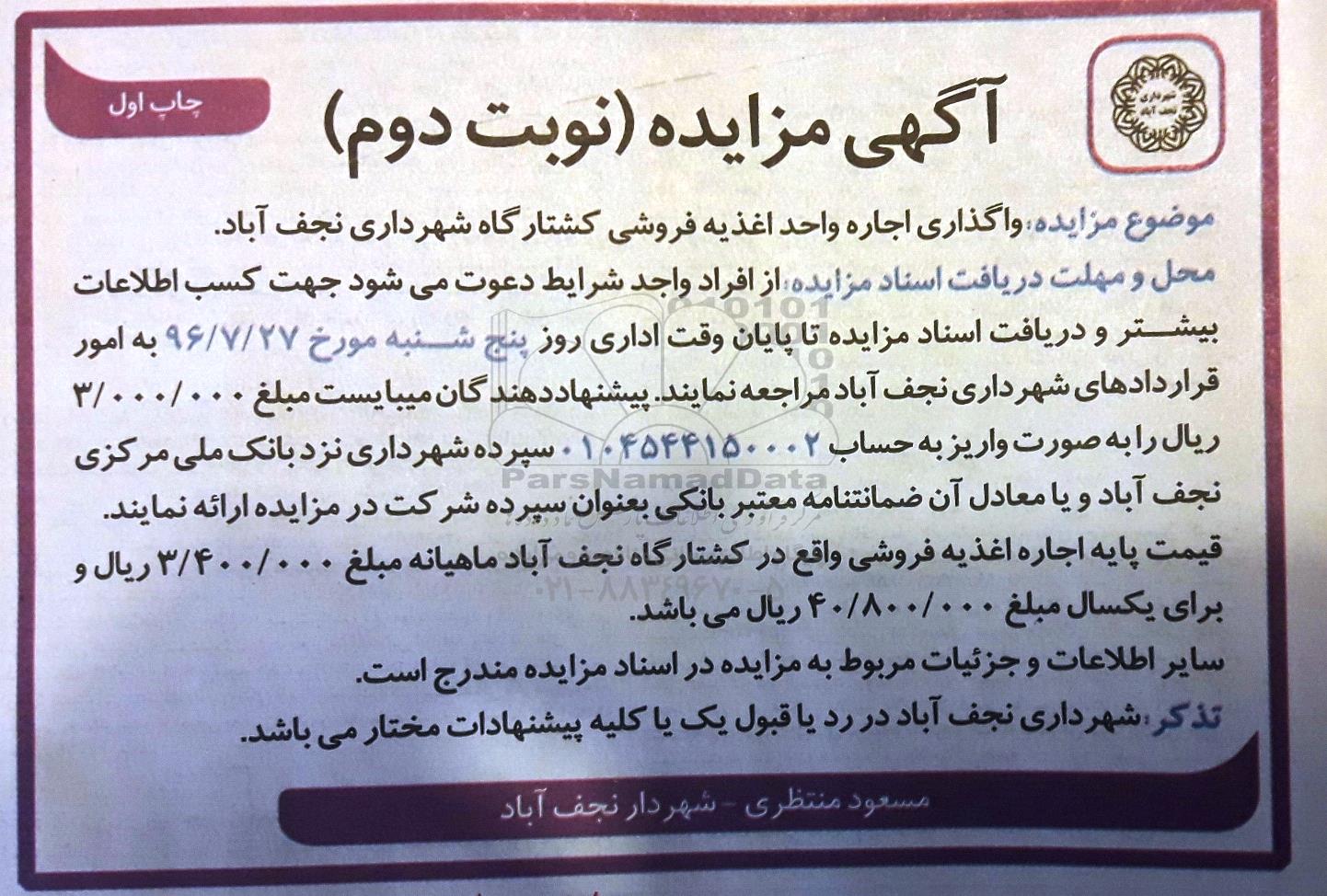 موضوع مزایده : واگذاری اجاره واحد اغذیه فروشی کشتارگاه شهرداری نجف آباد