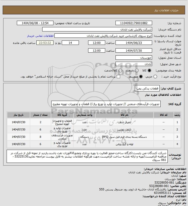 استعلام قطعات یدکی پمپ, استعلام قطعات یدکی پمپ