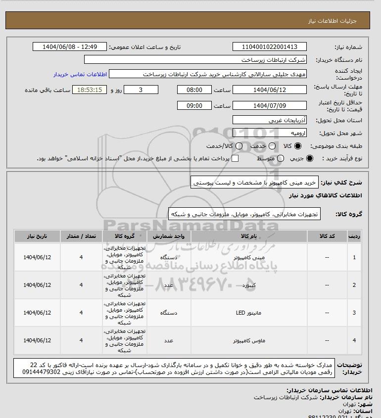 | 1 | -- | مینی کامپیوتر | دستگاه | تجهیزات مخابراتی، کامپیوتر، موبایل، ملزومات جانبی و شبکه | 4 | 1404/06/12 |