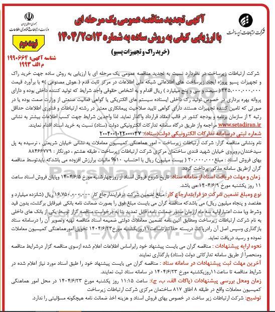 شرکت ارتباطات زیرساخت در نظر دارد نسبت به برگزاری مناقصه عمومی یک مرحله ای با ارزیابی به روش ساده جهت خرید راک و تجهیزات پسیو پروژه ایجاد زیرساختهای اطلاعاتی شبکه ملی اطلاعات در مرکز ثابت قدم (هوش مصنوعی) با برآورد قیمت 335.000.000.000 (سیصد و سی و پنج میلیارد) ریال اقدام و به اشخاص حقوقی واجد شرایط که تولید کننده داخلی بوده و دارای پروانه بهره برداری در خصوص تولید رک داخلی ایستاده سیستمهای الکتریکی یا گواهی فعالیت صنعتی از وزارت صمت بوده یا در صورتی که تامین کننده تجهیزات هستند دارای گواهی تایید صلاحیت پیمانکاری معتبر در رشته ارتباطات و فناوری اطلاعات حداقل رتبه 2 از سازمان برنامه و بودجه کشور در قالب انعقاد قرارداد واگذار نماید. لذا واجدین شرایط جهت کسب اطلاعات بیشتر به نشانی ستاد ایران مراجعه و از طریق درگاه سامانه تدارکات الکترونیکی دولت (ستاد) نسبت به خرید اسناد
