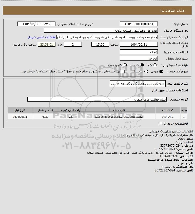 نام دستگاه خریدار:اداره کل دامپزشکی استان زنجان