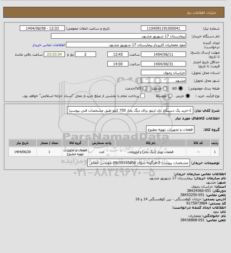 شرح کلی نیاز: 1-خرید یک دستگاه دی اریتور برای دیگ بخار 750 کیلو طبق مشخصات فنی پیوست